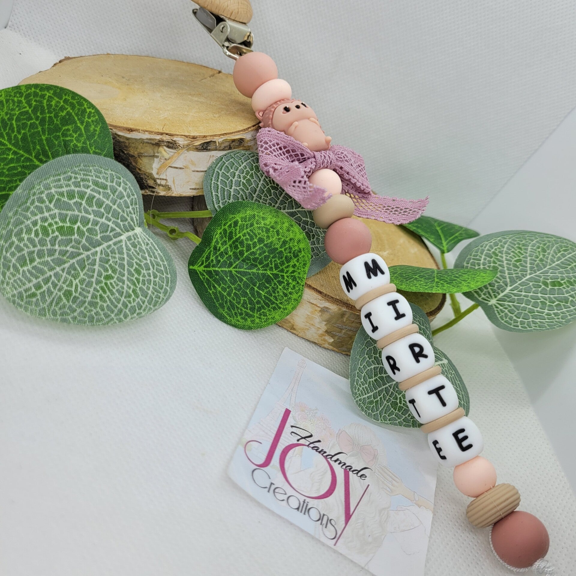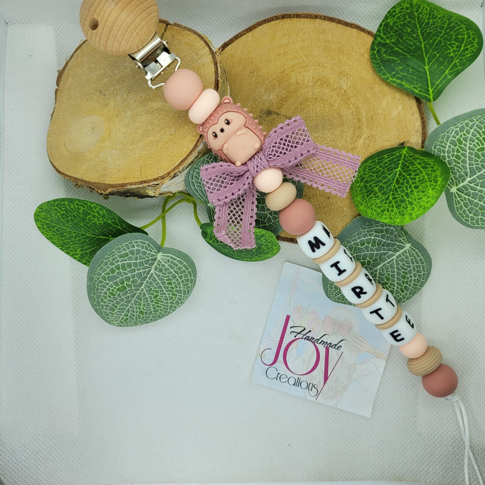 Fopspeenketting met houten clip en rstrikje.