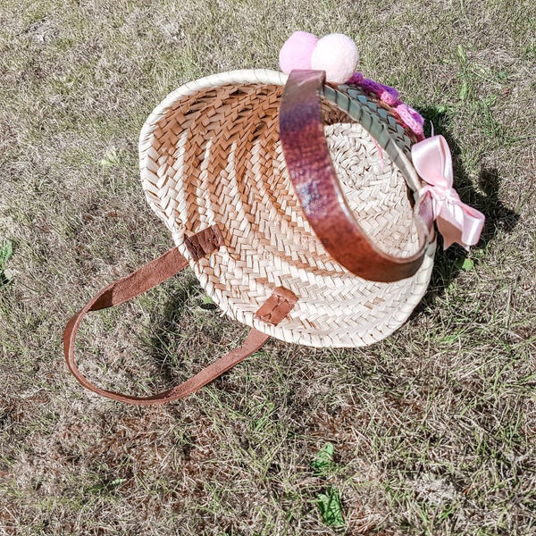 Mini draagmandje riet voor kinderen. gevlochten riet. Dit is een tasje waarin jouw kindje paaseitjes kan rapen (paasmand) of mee naar het strand kan met strandspeelgoed in (strandmand) of als eigen boodschappentasje.