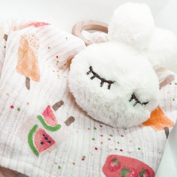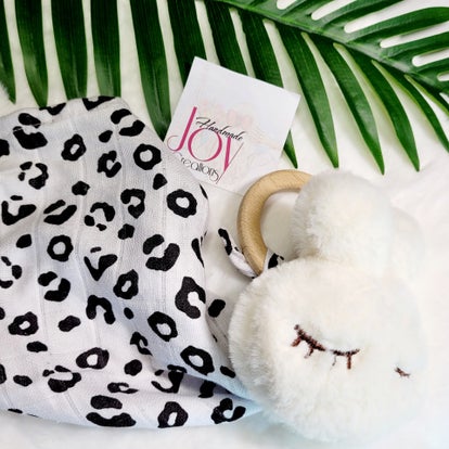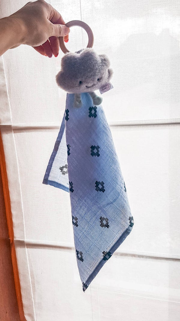 Knuffeldoekje met houten bijtring. Alles kan zelf gedemonteerd worden om te wassen. De tetradoek hangt geknoopt rond de bijtring en de knuffel hangt met een gehaakt ringetje rond de tetradoek.