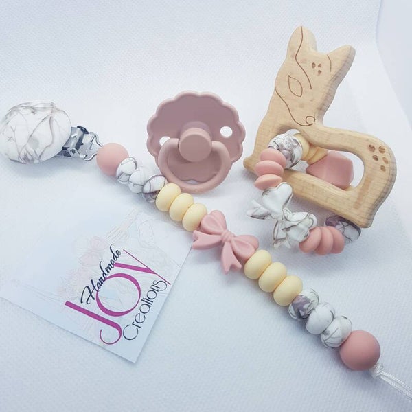 Past bij fopspeen Frigg Blush. Ook een bijtring hiervan te vinden.