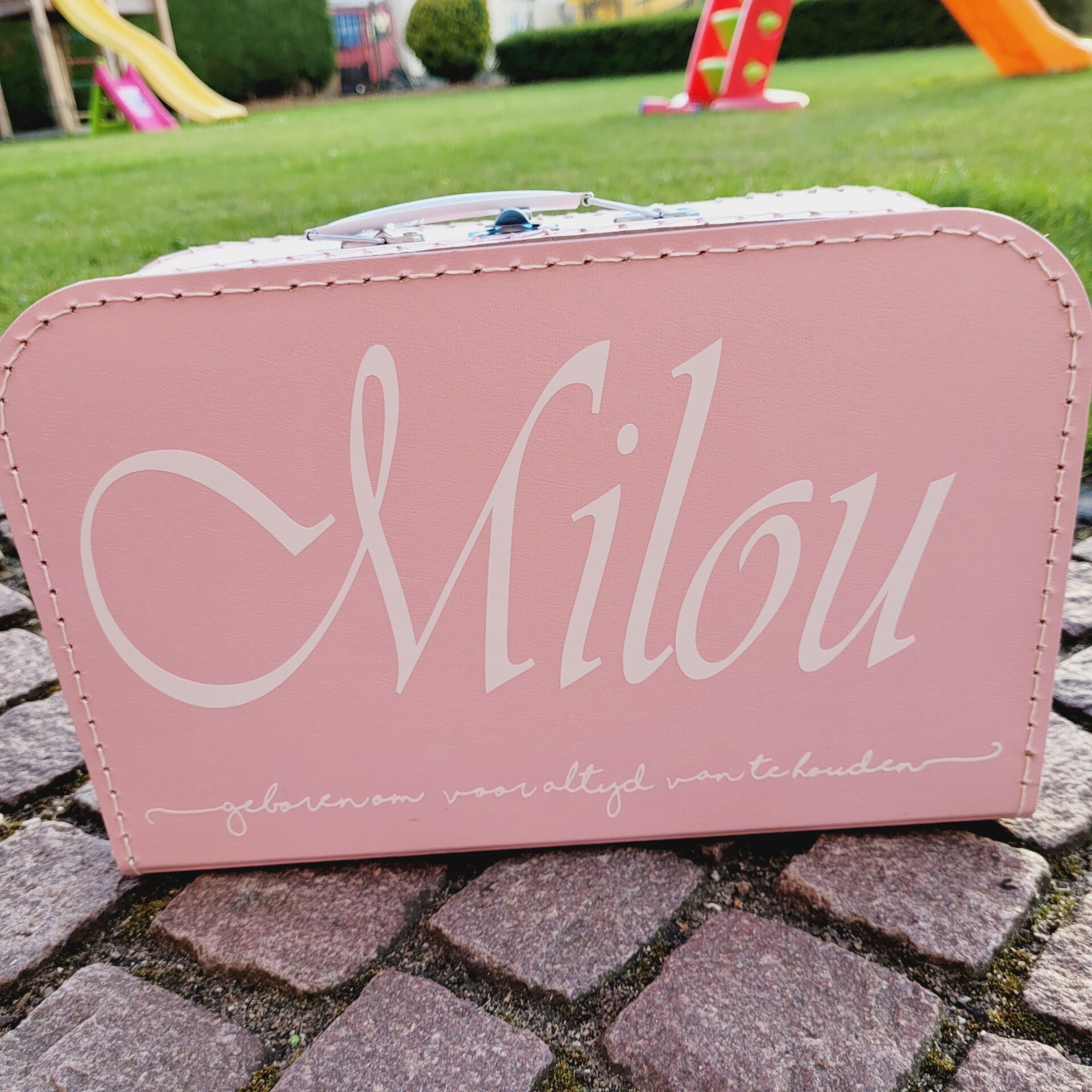 Met binnenin een motiefje, afgewerkt met metalen randjes en slotje.