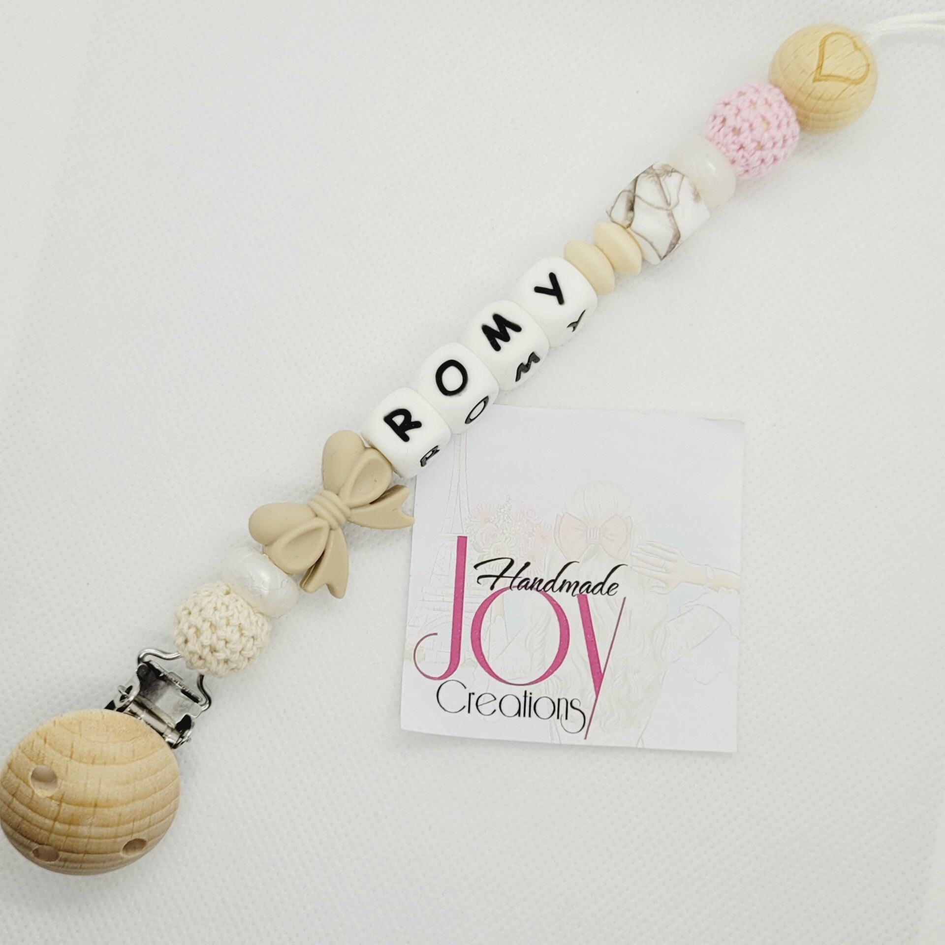 Fopspeenketting met gehaakte kralen en naam.
