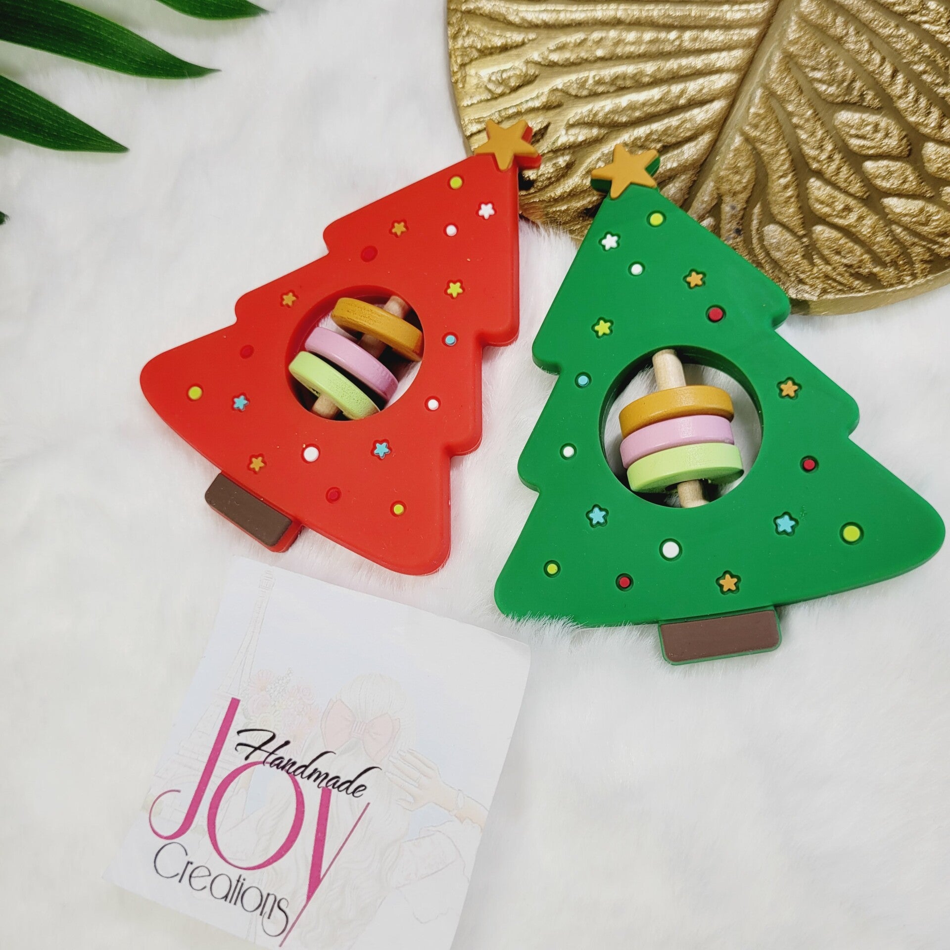 Kerstboom bijtring met houten ringen.