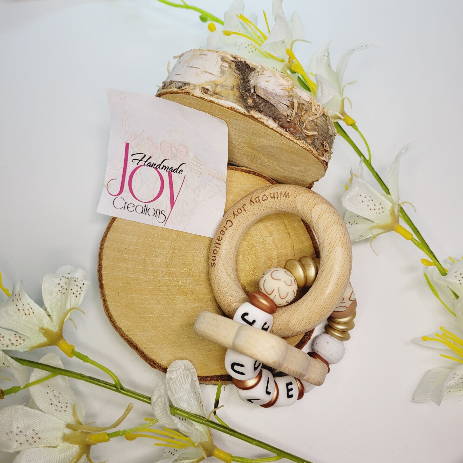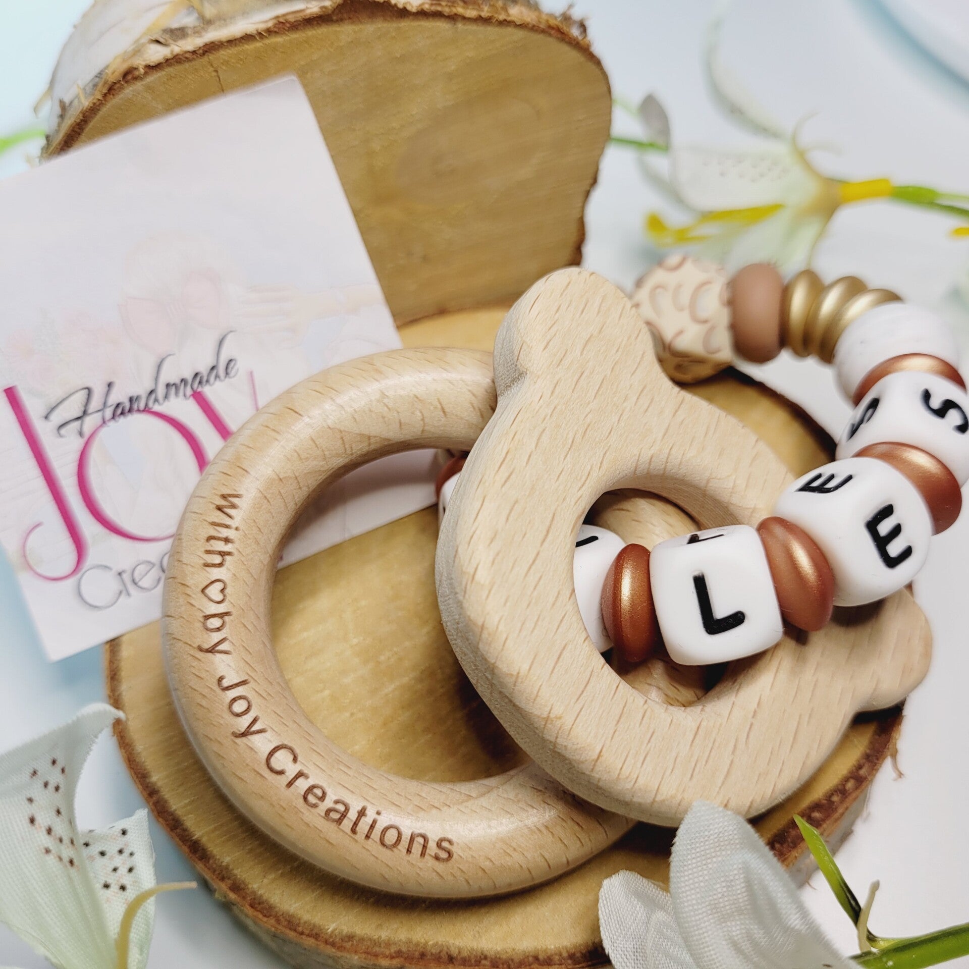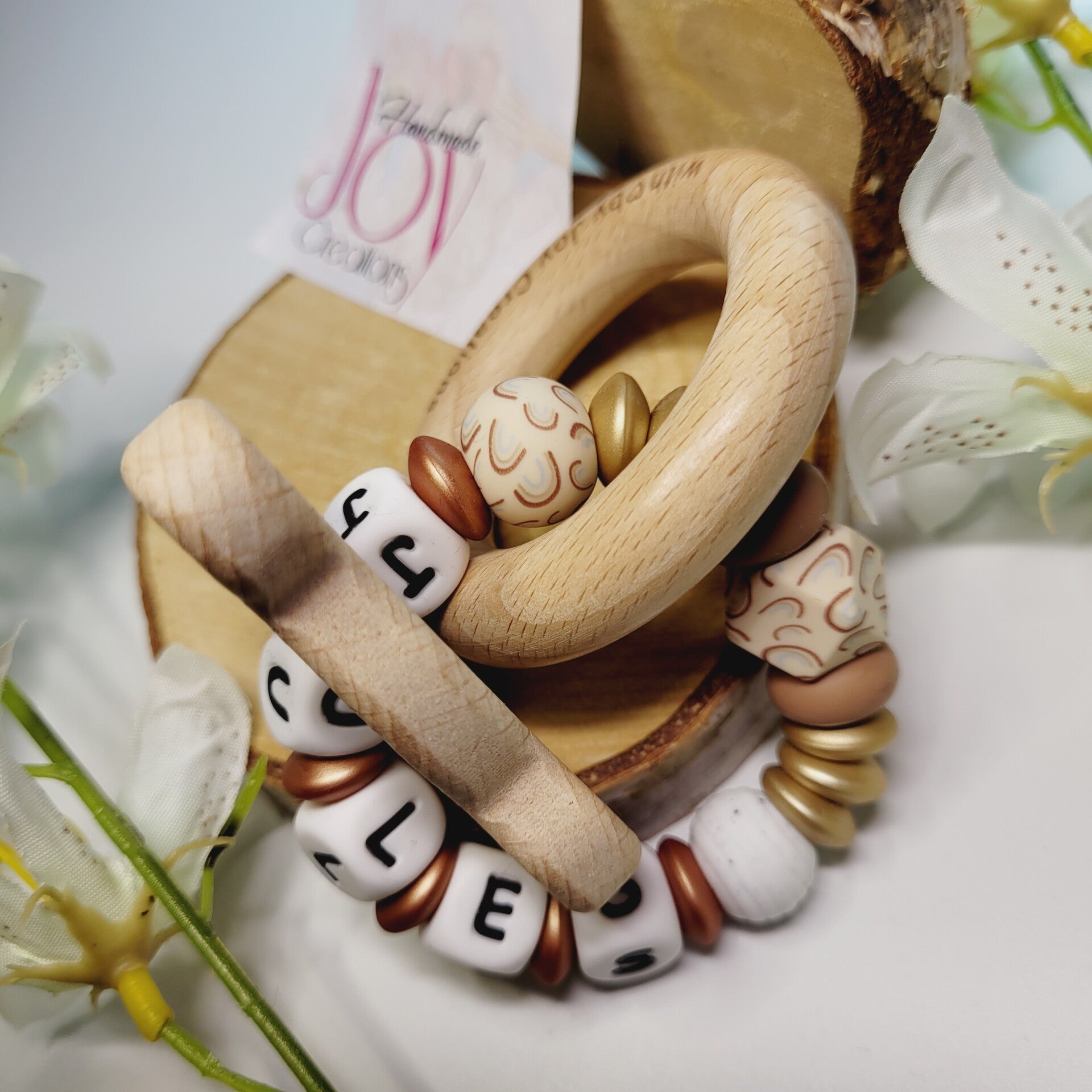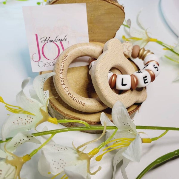 Bijtring uit houten figuren en silcionen kralen met regenboog